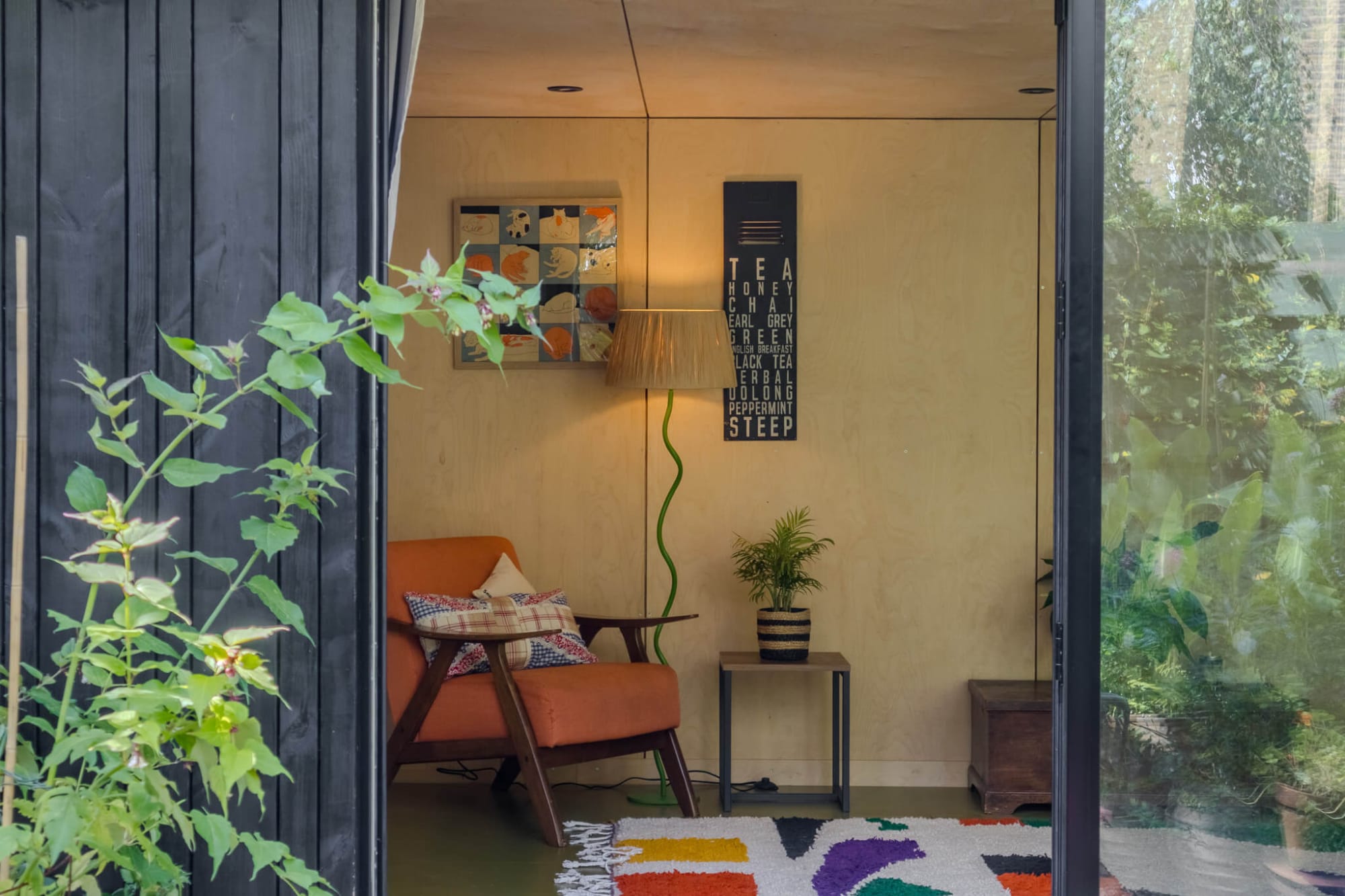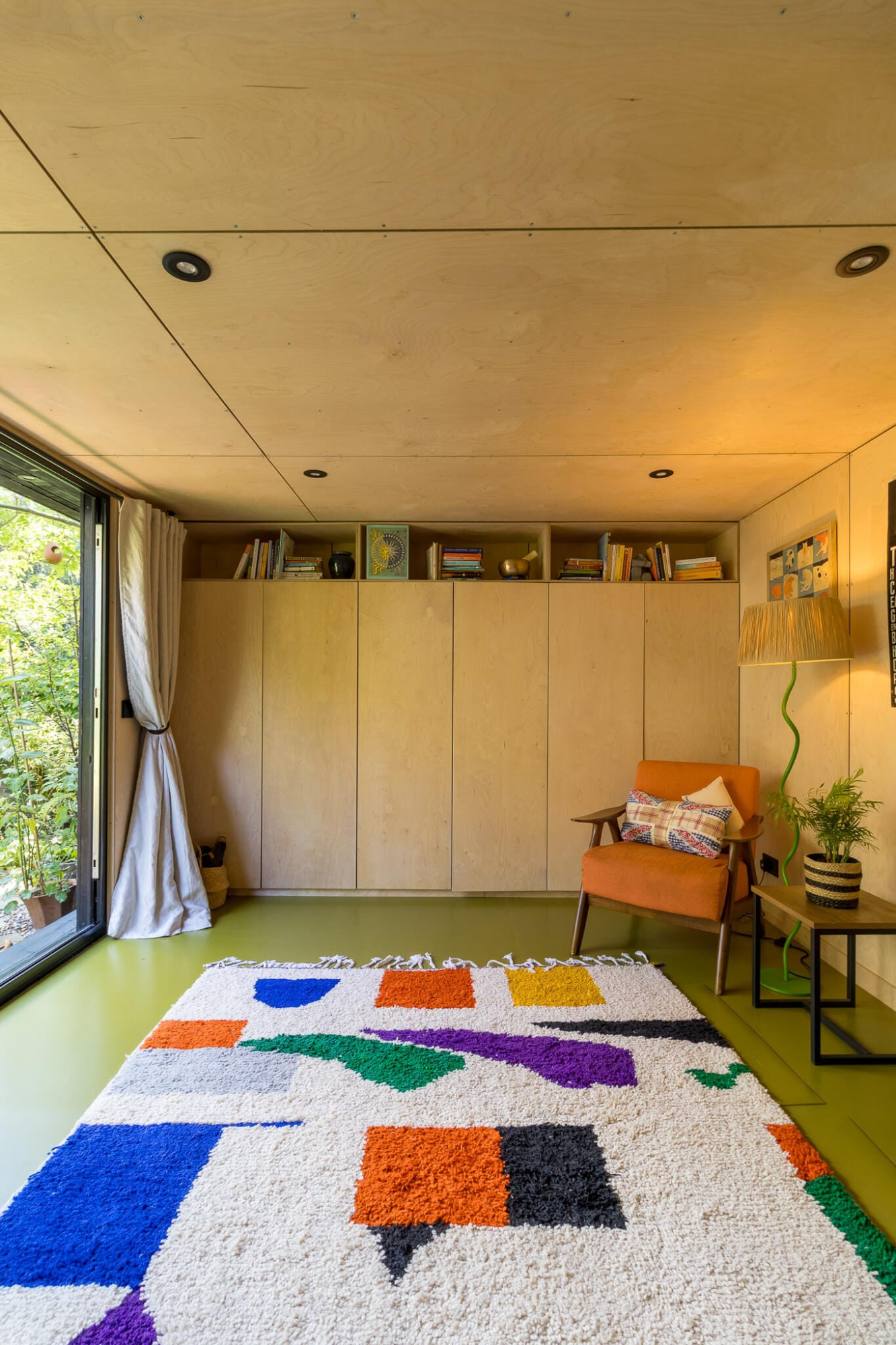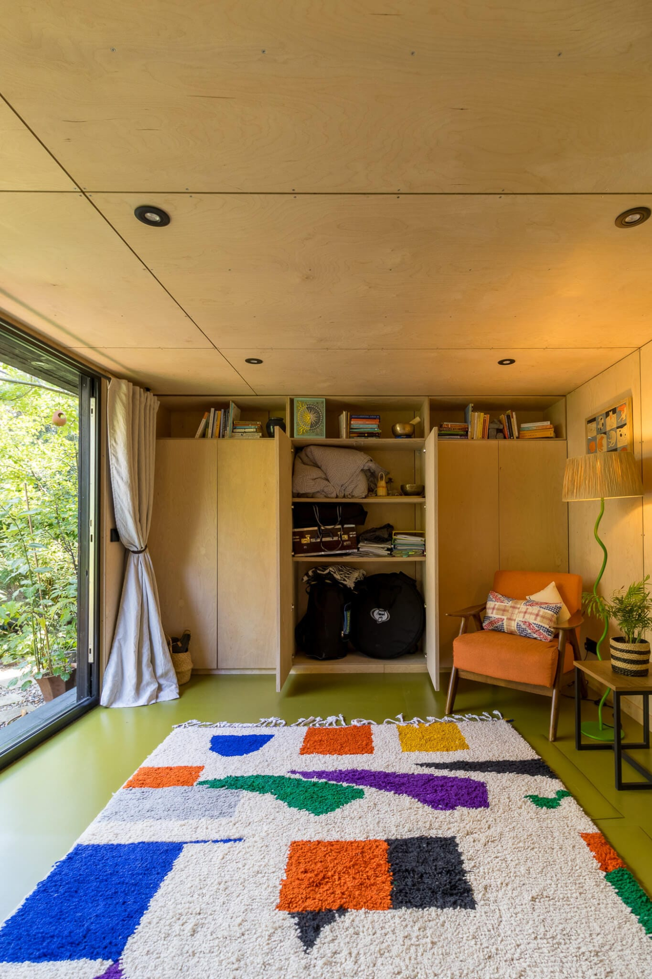 This custom studio was designed to serve multiple functions for the client, a professional gardener. Inside, the pod serves as a cozy guest bedroom, offering a private and welcoming retreat for visitors. With just a quick rearrangement, the same space transforms into a serene yoga studio filled with natural light and calming views of the property.